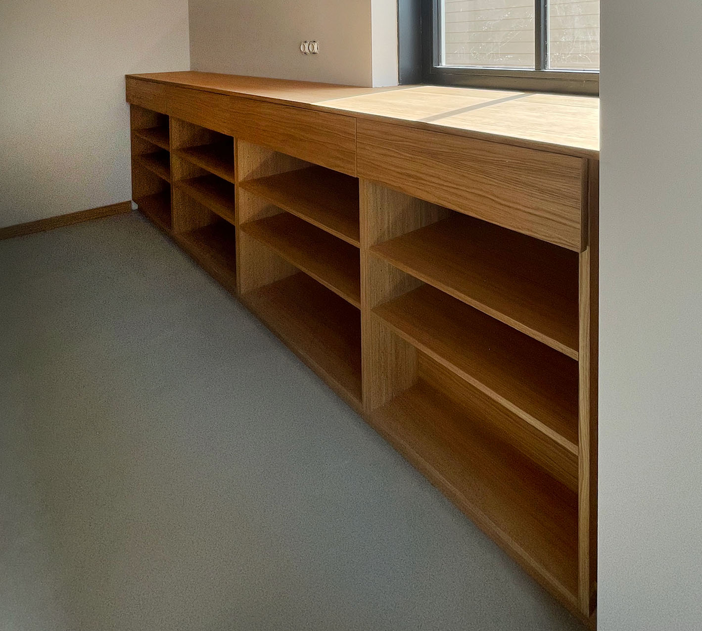 Door aan beide zijden van de ruimte kasten te plaatsen is de ruimte optimaal benut met voldoende aflegruimte aan de linkerzijde.